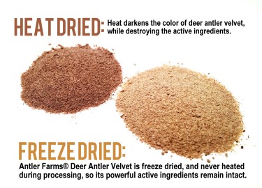 Antler Farms® deer antler velvet is freeze dried. Our deer antler velvet is never heated during processing, so the active ingredients are never compromised.