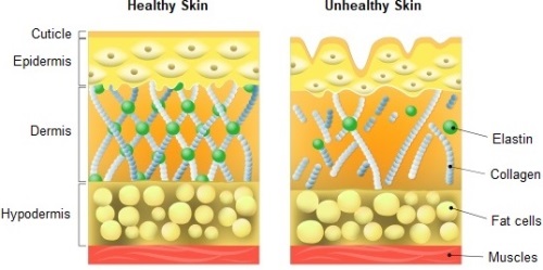 When the collagen is depleted, the dermal layer loses its structural integrity. Without collagen to hold skin's outer layer in place, wrinkles begin to form. Skin becomes thin, saggy and uneven. Replenishing collagen keeps the skin firm by building up the dermal layer. It also increases skin elasticity and moisture.