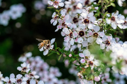 Our honey originates from the native New Zealand bush Leptospermum scoparium, commonly known as the Manuka tree. These special shrubs grow in coastal forests in remote, pristine wilderness areas. In the spring, our bee colonies are strategically placed in these isolated locations just as the Manuka flowers bloom. The bees forage the nectar and deposit it into honeycombs, where it is later harvested.